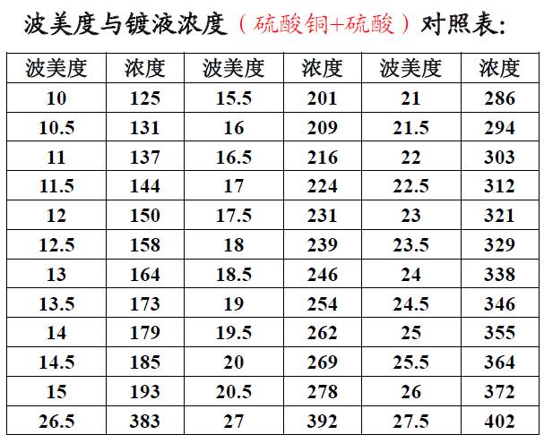 significantly reduces the resistance of the plating solution and prevents the hydrolysis precipitation of copper sulfate. Its chemical reaction formula is as follows: CuSO4+2H2O==Cu(OH)2+H2SO4 If a smell like ammonia is emitted, there is a problem. If the concentration of the bath solution is not appropriate, monovalent copper ions (Cu+) will be produced, causing pitting and pinholes on the copper plating surface. When sulfuric acid content is low, the plating layer is rough, and the anode is passivated. Increasing sulfuric acid content can improve uniform plating ability, but some brighteners are prone to decomposition. Some companies specify its content as 40-60g/L, some as 55-65g/L, and others as 60-70g/L. Some companies control the copper sulfate content at 180-270g/L and the sulfuric acid content at 55-65g/L, achieving very good results, making the copper layer reach optimal hardness and extending the storage period. At a temperature of 15°C, the corresponding relationship between copper sulfate + sulfuric acid content and Baume degree is shown in the table.